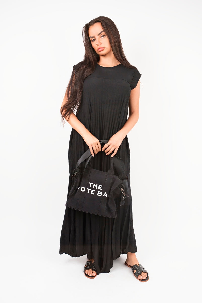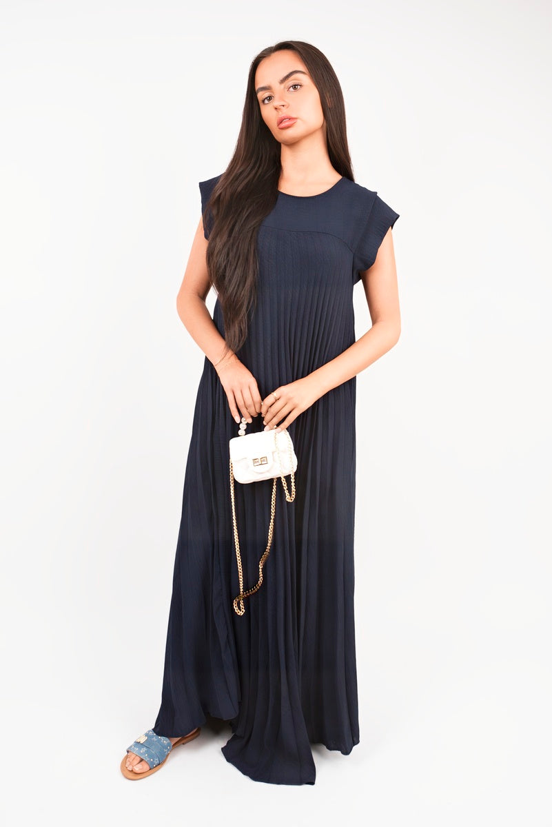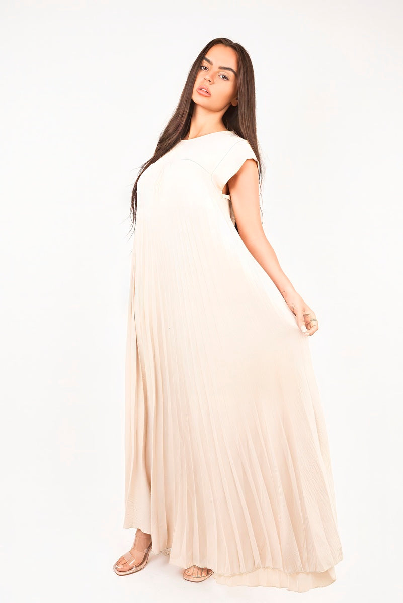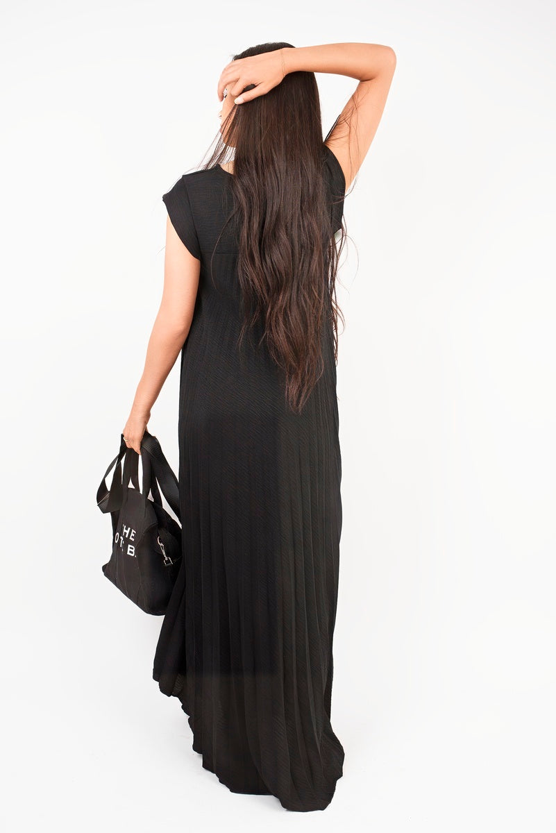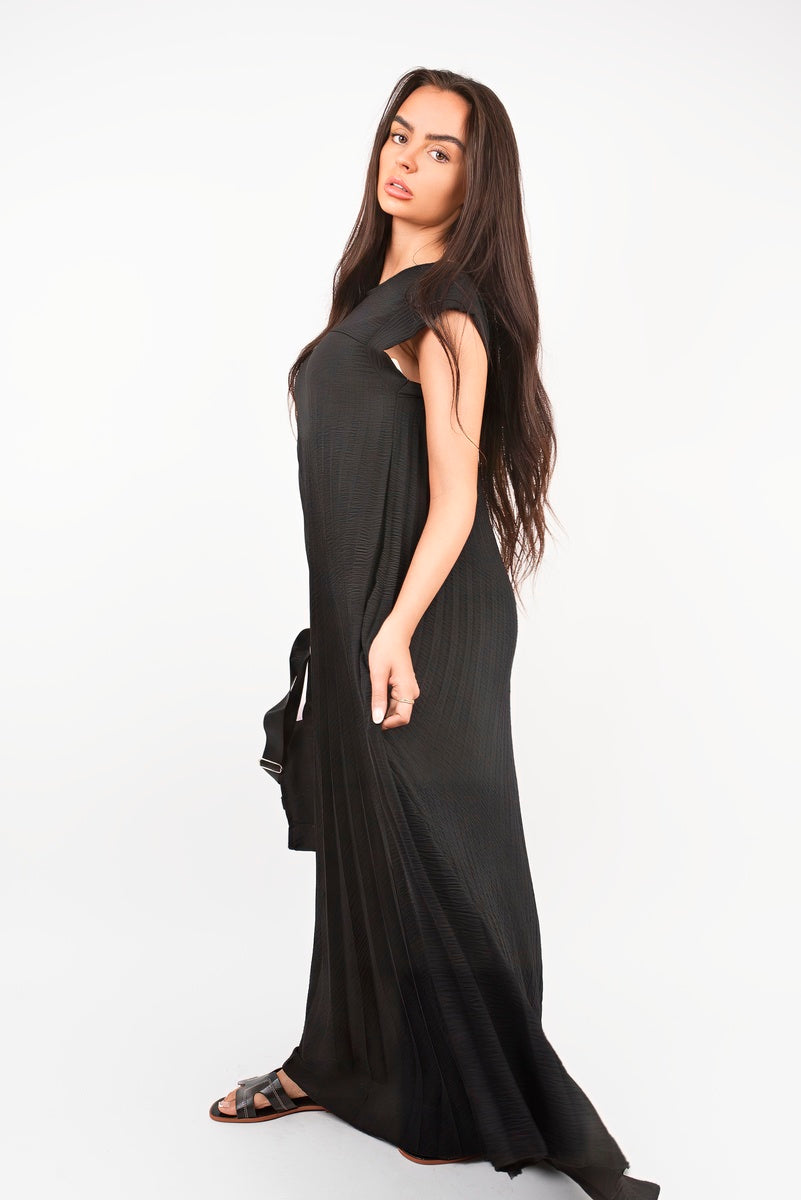 Add effortless movement to your wardrobe with this floaty pleated maxi dress. Designed with a softly draped silhouette and cap sleeves, it gives you that throw-on-and-glow vibe in seconds. The relaxed fit glides as you move, while the luxe texture keeps it feeling elevated. Just pair with sandals or heels for an easy glam look that works day or night.